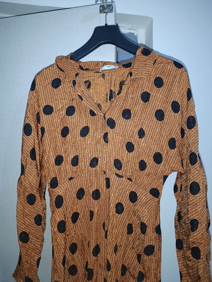 Yumuşak keten kumaştan, düğmeli ön ve V yaka detaylı, bol kesim uzun boy puantiyeli hamile bluz. Koyu kahverengi ve siyah renklerde, vintage bohem stilini yansıtır.