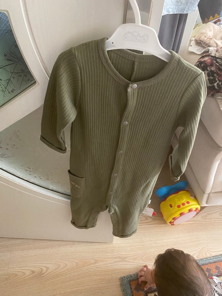 Yumuşak triko kumaştan, düğmeli uzun kollu, bisiklet yaka ve düz renkli erkek bebek tulumu.