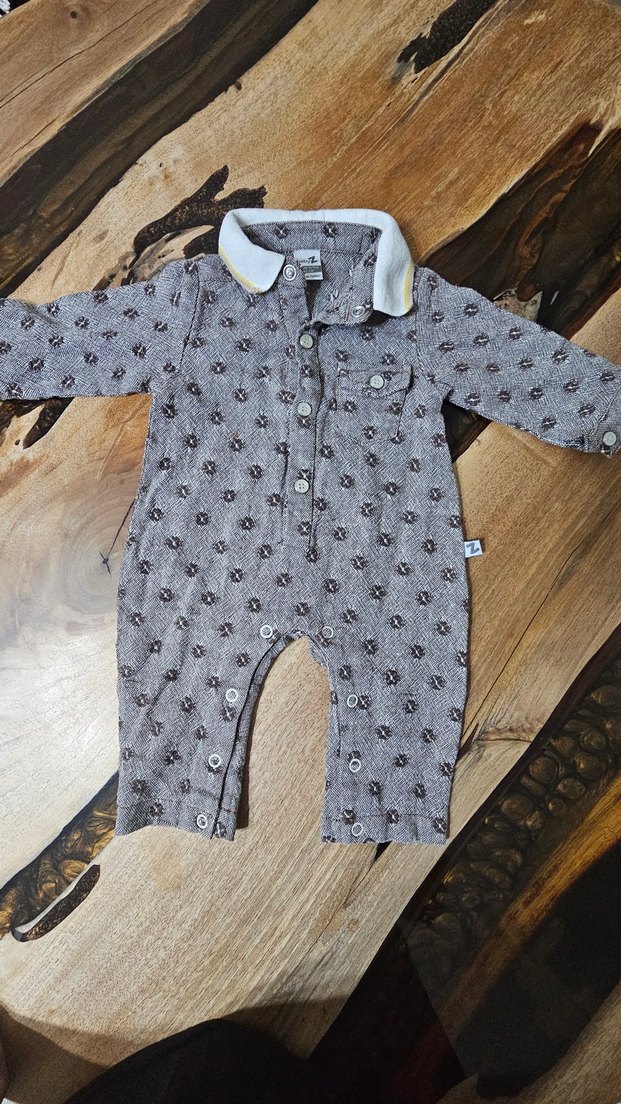 Düğmeli, uzun kollu ve yakalı erkek bebek tulumu. Yumuşak ve sıcak kumaştan, gri tonlarda baskılı desenli, sokak stili için uygun. 3-6 ay 62 cm