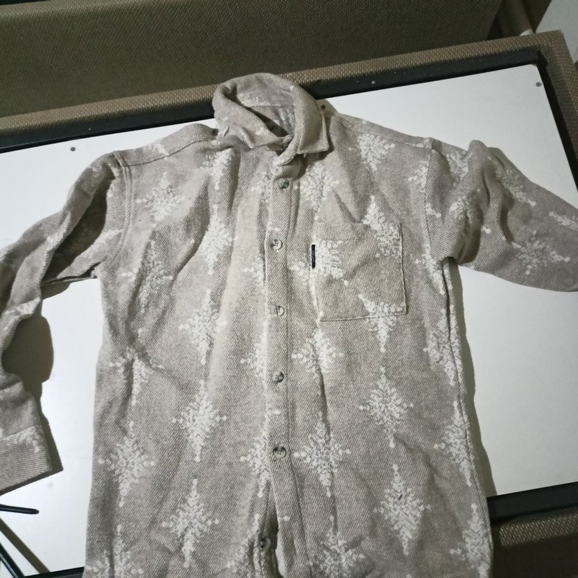 Düğmeli, uzun kollu ve yakalı erkek gömleği, yumuşak ve sıcak kumaştan. Bol kesim, bej ve gri tonlarda hafif desenli. Günlük kullanıma uygun.