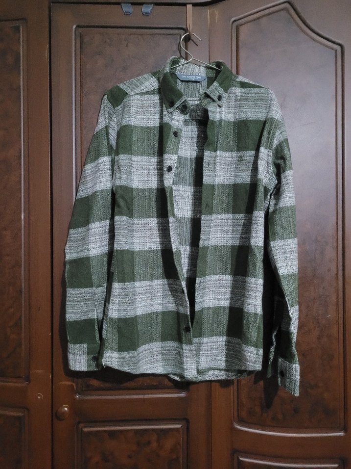Düğmeli, uzun kollu, bol kesim erkek gömleği. Notlu yaka ve yeşil-gri kareli desene sahip, gündelik kullanıma uygun.