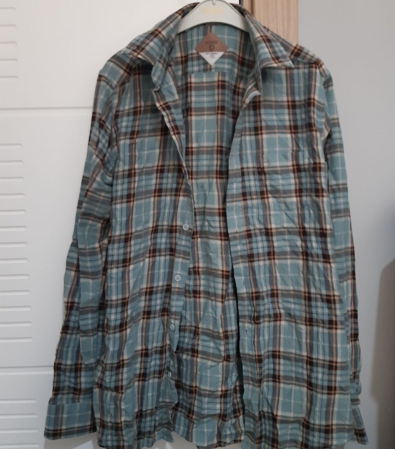 Pamuk kumaştan, düğmeli ve uzun kollu erkek gömlek. Salaş kesimi ve kareli deseniyle günlük rahat sokak stili için uygundur. Kullanılmamış,temiz.