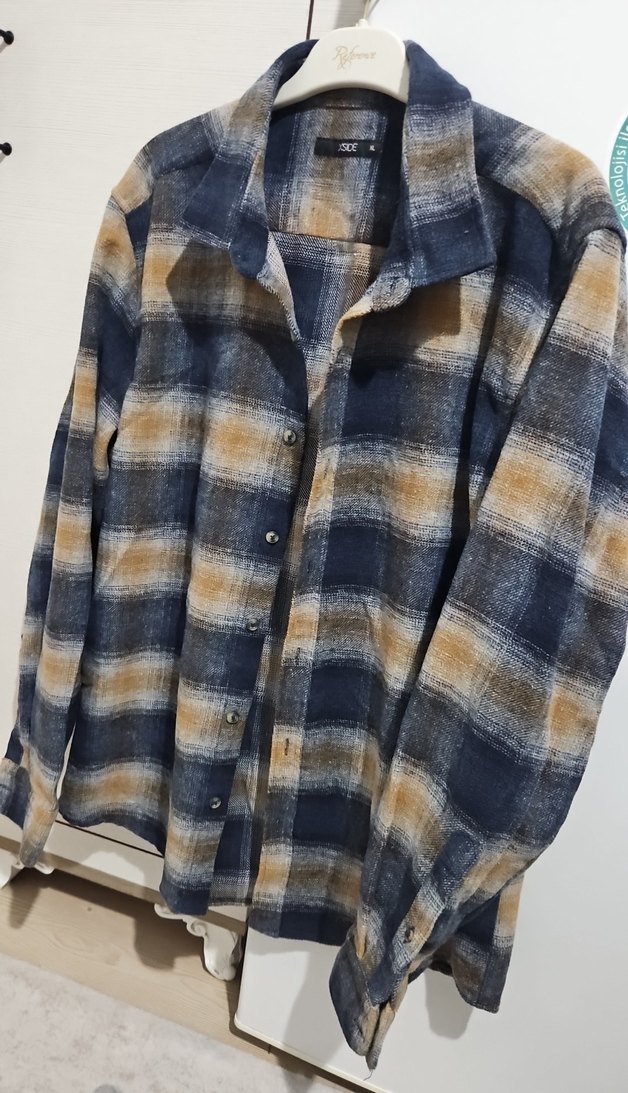 Düğmeli, uzun kollu, bol kesim erkek gömleği. Gri ve bej tonlarında batik desenli, yumuşak yün kumaştan, çentikli yaka ile günlük sokak stili için uygun.