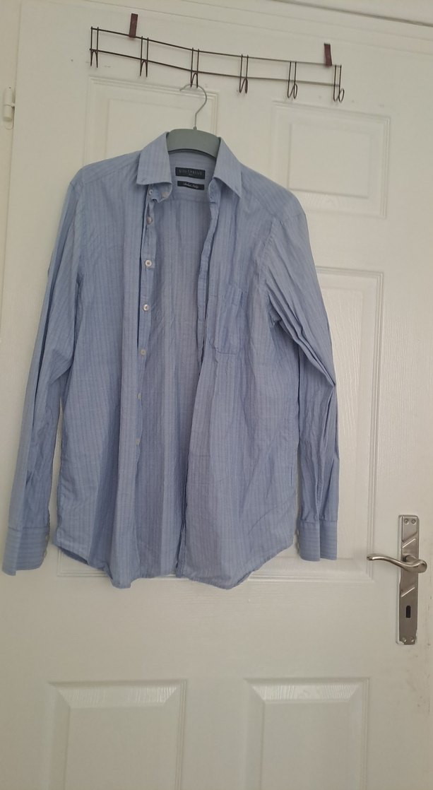 Düğmeli, uzun kollu, yakalı ve regular fit erkek keten gömlek. Mavi-gri tonlarında, ofis ve günlük sokak tarzına uygun.