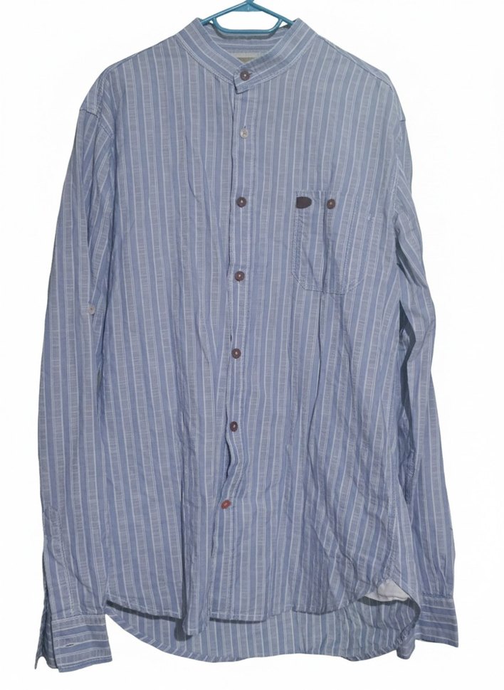 Düğmeli ön kısımlı, yakalı ve uzun kollu erkek keten gömlek. Rahat kesim, mavi-gri tonlarında günlük ve sokak stiline uygun.