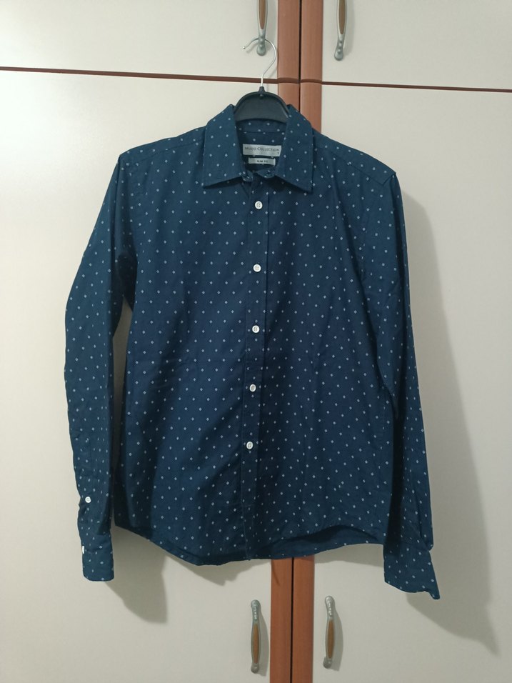 Düğmeli, uzun kollu, kesimli yakalı ve normal boyda kot kumaştan yapılmış parlak mavi erkek gömlek. Ofis kullanımı için uygundur.