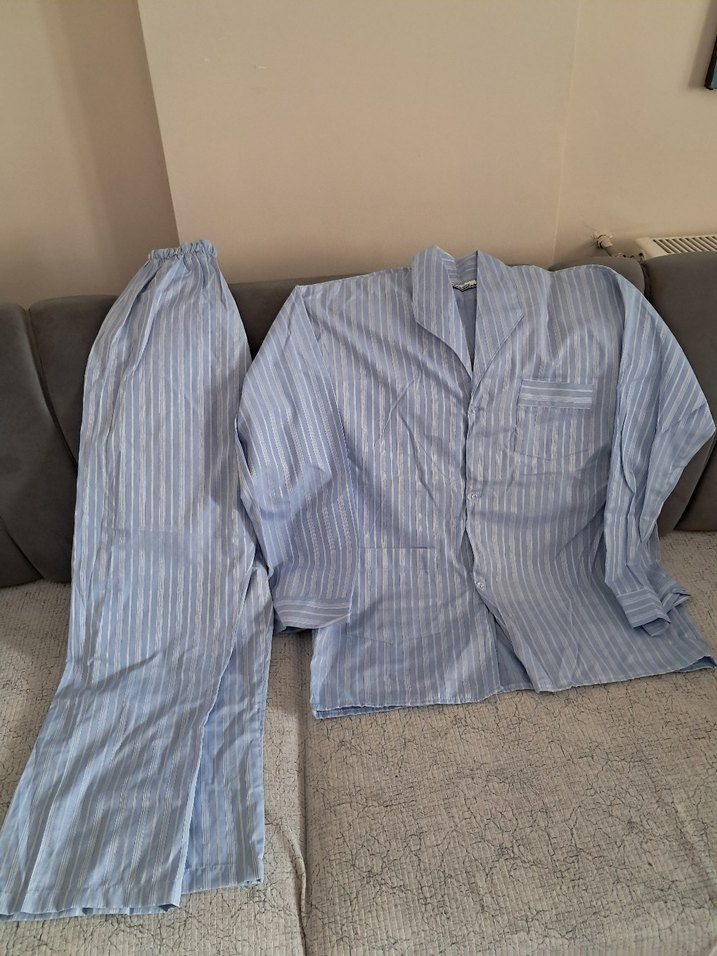Düğmeli ön kısmı, uzun kolları ve yakalı kesimi olan, normal midi boyda, mavi-gri çizgili desenli erkek pijama takımı. Rahat ve konforlu. hiç kullanılmadı