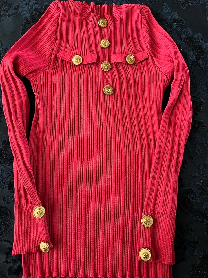 Düğmeli, uzun boylu ve yüksek yakalı bu triko kazak, fit kesimi ve ön ile kol manşetlerindeki düğme detaylarıyla dikkat çekiyor. Koyu kırmızı renkte, sokak modasına uygun.