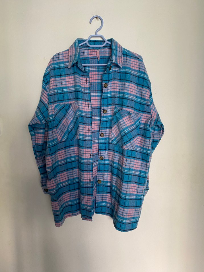 Gevşek kesim, uzun kollu ve düğmeli kadın gömleği. Pastel tonlarda batik desenli, yumuşak ve sıcak kumaştan, günlük rahat kullanım için uygundur. İki kol arası 57,boy 74 cm.Hiç kullanılmadı.40-42 bedene olur.