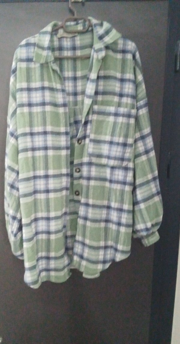 Yumuşak keten kumaştan, düğmeli ve uzun kollu gevşek kesim kadın gömleği. Yakalı ve pastel yeşil kare desenlidir, günlük kullanıma uygundur.
