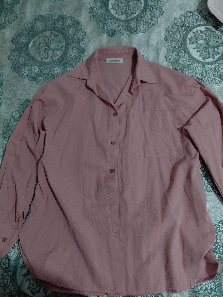 Pazarlık payı vardır. Düğmeli, uzun kollu ve yakalı, gevşek kesim kadın gömleği. Yumuşak pastel bej renkte, günlük kullanım için uygun.