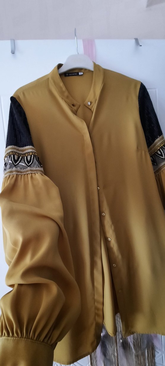 Camel renginde, uzun kollu, düğmeli ve yakalı bohem tarzda Nakış detayları ve yumuşak, parlak kumaştan üretilmiştir, ofis için uygundur.