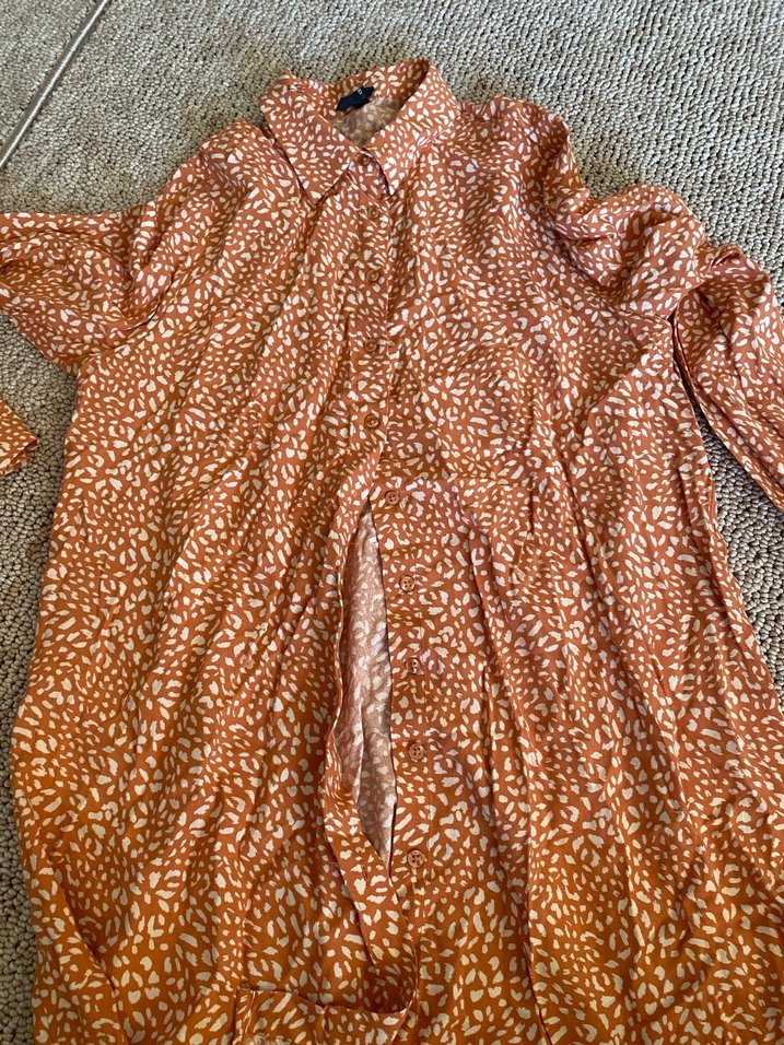 Düğmeli, uzun kollu, yakalı ve bol kesim hamile Yumuşak keten kumaştan, renkte ve hafif desenli, günlük kullanım için uygun.