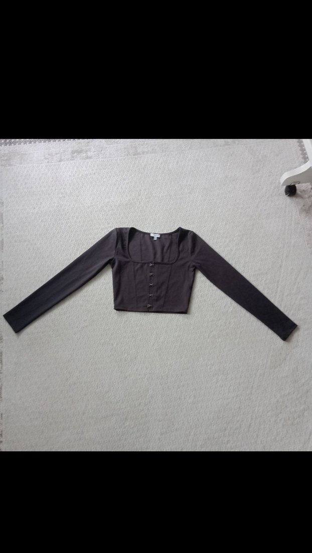 Düğmeli Uzun Kollu Gri Crop Bluz