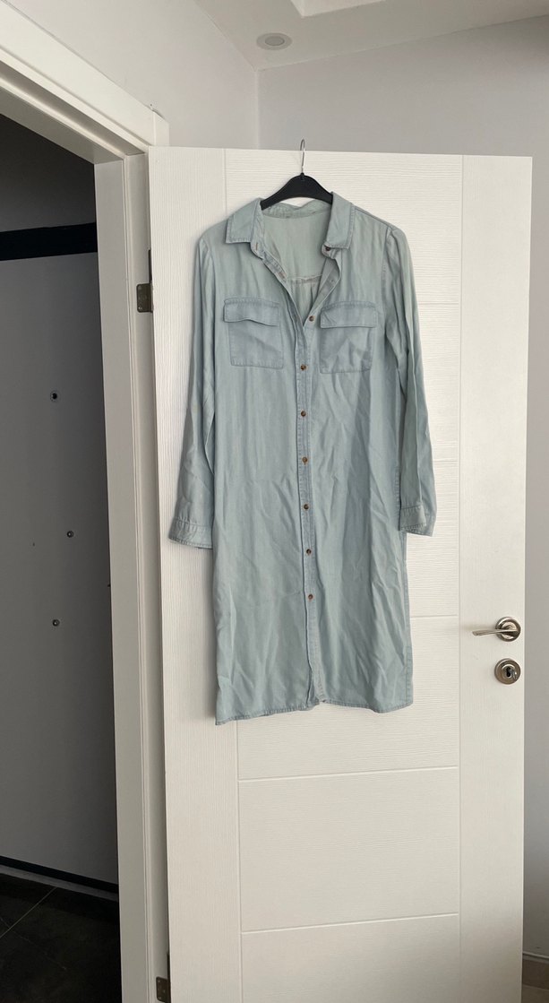 Gri renkte, düğmeli, uzun kollu ve bol kesim denim kadın gömleği. Yakalı ve gündelik sokak stiline uygun.