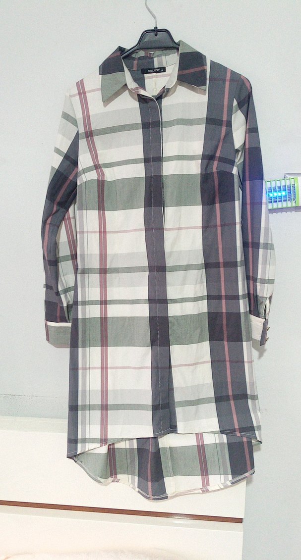 Pamuk kumaştan, düğmeli ve uzun kollu bu kadın gömlek, gri ve farklı renklerde ekose desenlidir. Regular fit ve uzun kesime sahiptir.