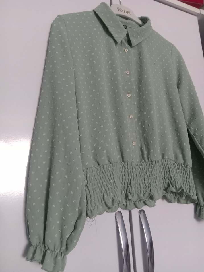 Gri renkte, düğmeli ve uzun kollu, rahat kesim kadın bluz. Keten kumaştan üretilmiş, yuvarlak yakalı ve büzgülü etek ucu detaylıdır.