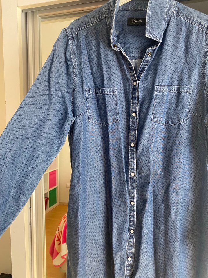 Düğmeli önü, yaka detaylı ve uzun kollu, bol kesim gri mavi denim gömlek. Normal midi boyda, iki cep detaylı, günlük sokak stili için uygun.