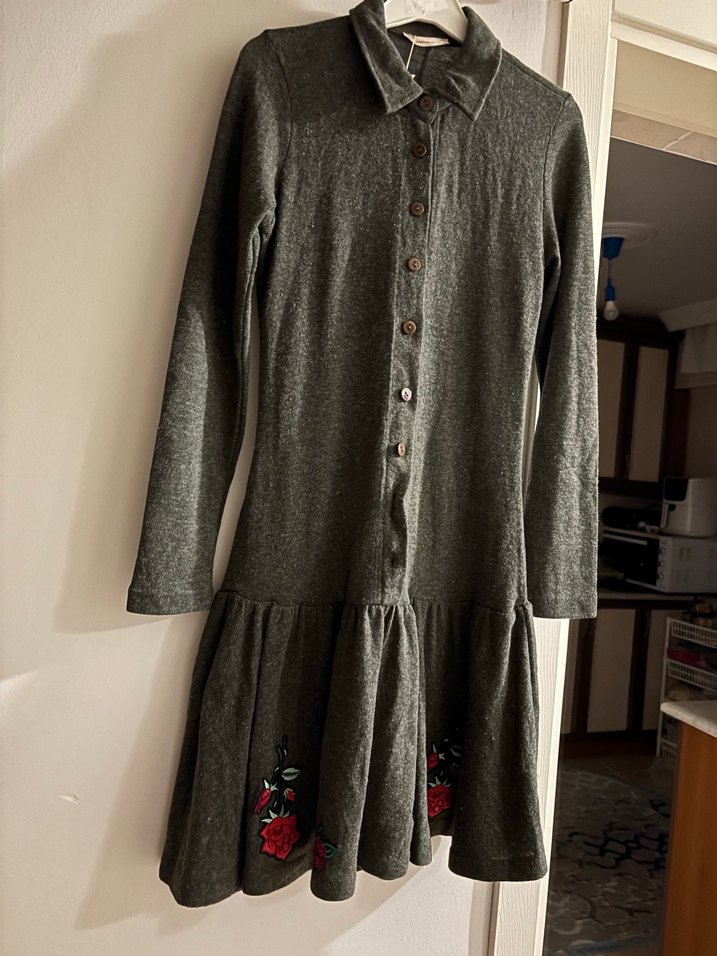 Kadınlar için düğmeli, uzun kollu ve notalı yaka detaylı gri örgü elbise. Yün kumaştan, bol kesim ve etek kısmında nakışlı çiçek desenleriyle rahat ve bohem tarz sunar.