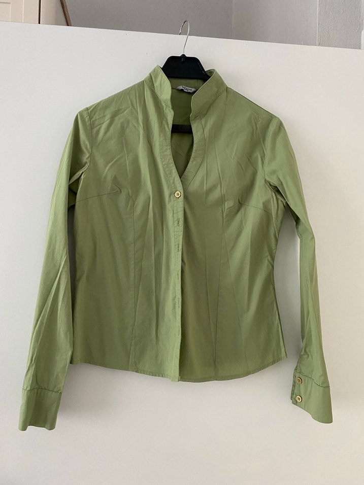 Düğmeli, uzun kollu, yakalı haki kadın gömlek. Düz, parlak sentetik kumaştan, midi boyda ve regular fit kesimlidir. Günlük ve ofis kullanımı için uygundur.