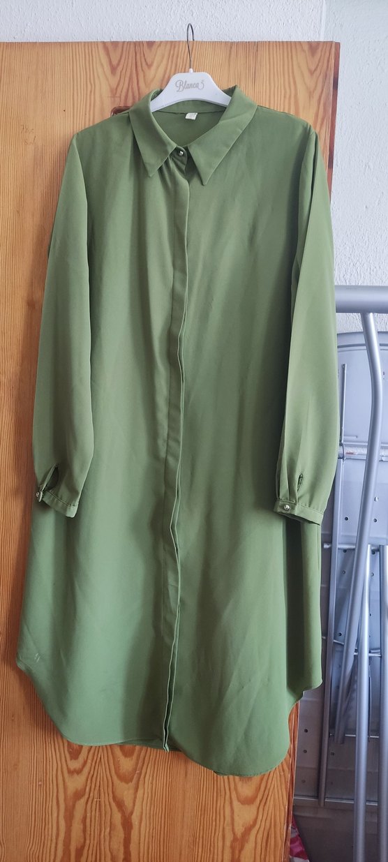 Uzun boy, düğmeli ve notalı yaka detaylı haki renkli kadın tunik. Bol kesim, uzun kollu ve parlak görünümlü, ofis için uygun. hediye geldi hiç giymedim.