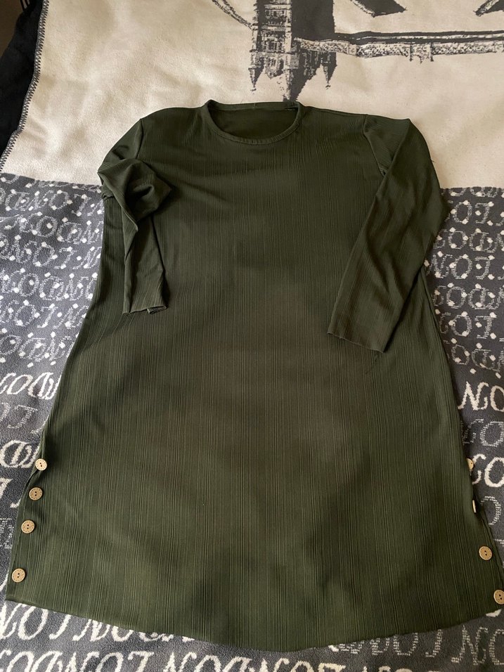 Düğmeli yan detaylı, uzun kollu, bol kesim haki renk kadın tunik. Rahat ve yumuşak sentetik kumaştan üretilmiş, günlük sokak stiline uygun.