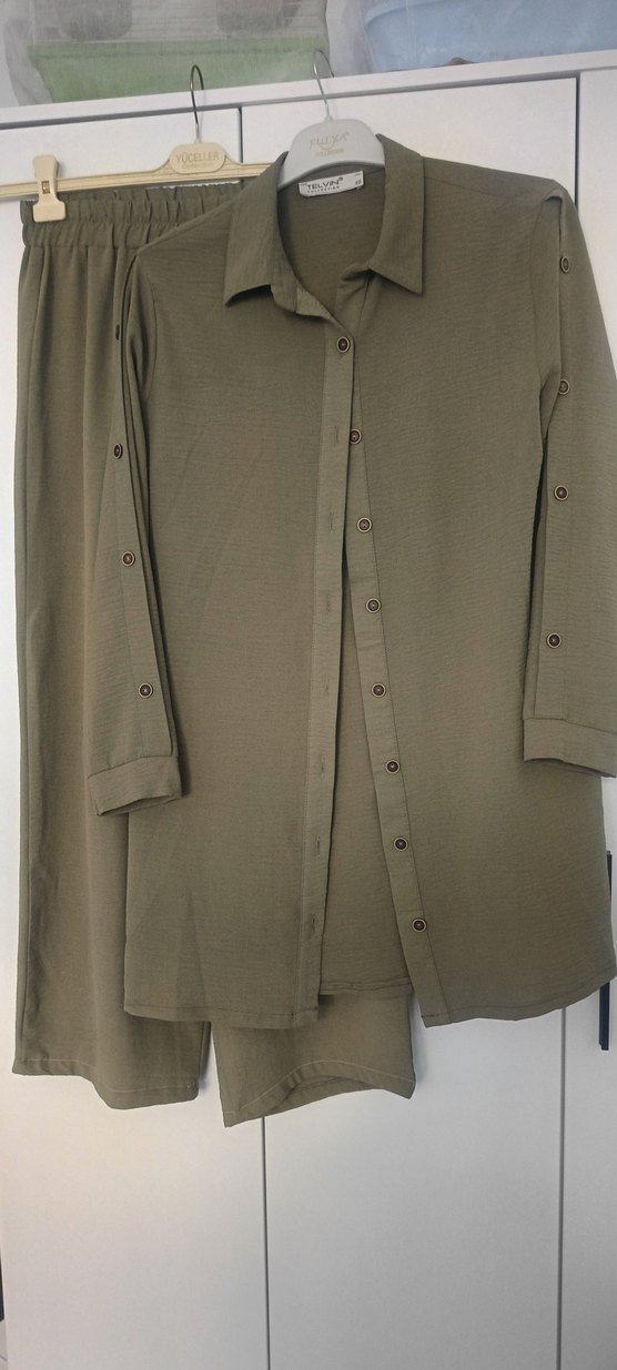 Ürün bol olduğu için kollardan daraltılmıştır. Yeni gibi hiçbir sıkıntısı yoktur. 44 bedene kadar uyumludur #ikilitakım
