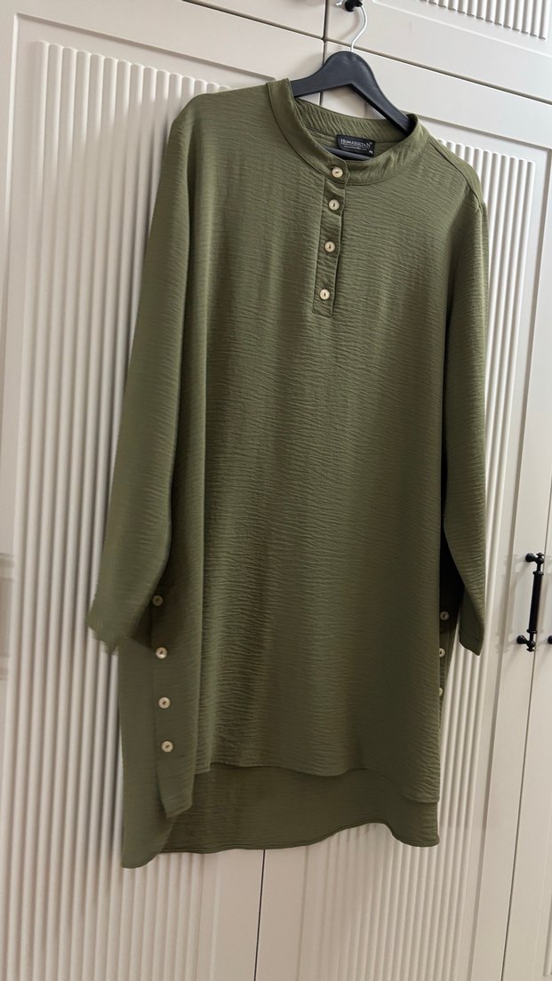 Bol kesim haki tunik, uzun kollu ve yuvarlak yakalıdır. Ön ve yanlarda düğme detayları bulunur. Sentetik kumaştan rahat ve gündelik bir görünüm sunar. Çok rahat ince tiril tiril bir kumaşı vardır bol kesimdir önü biraz kısa arkası uzundur 50 bedene kadar rahatlıkla olur