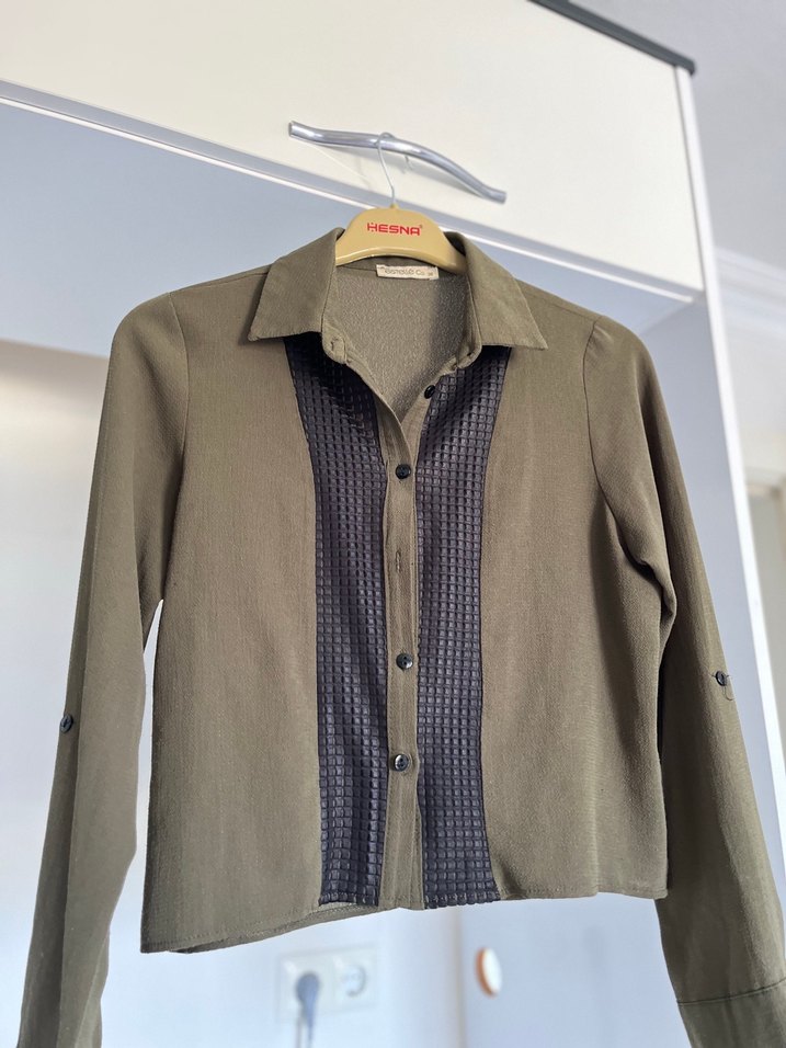 Haki yeşili kadın gömlek, uzun kollu, düğmeli ve kesik yaka detaylıdır. Normal boyda ve regular fit, sentetik kumaştan üretilmiştir. Ofis ve günlük kullanıma uygundur. Sadece 1 düğmesi ekesik dikilebilir. Aksi takdirde hiç bir defosu yoktur. Kaliteli ürün.