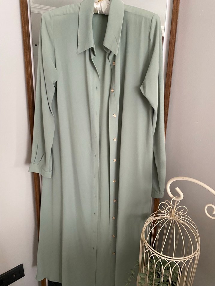 Bu haki renk hamile bluzu, uzun kollu ve düğmeli ön kısmıyla bol kesimdir. Satenimsi kumaştan yapılmış, minimal ve normcore tarzıyla ofis için uygundur.