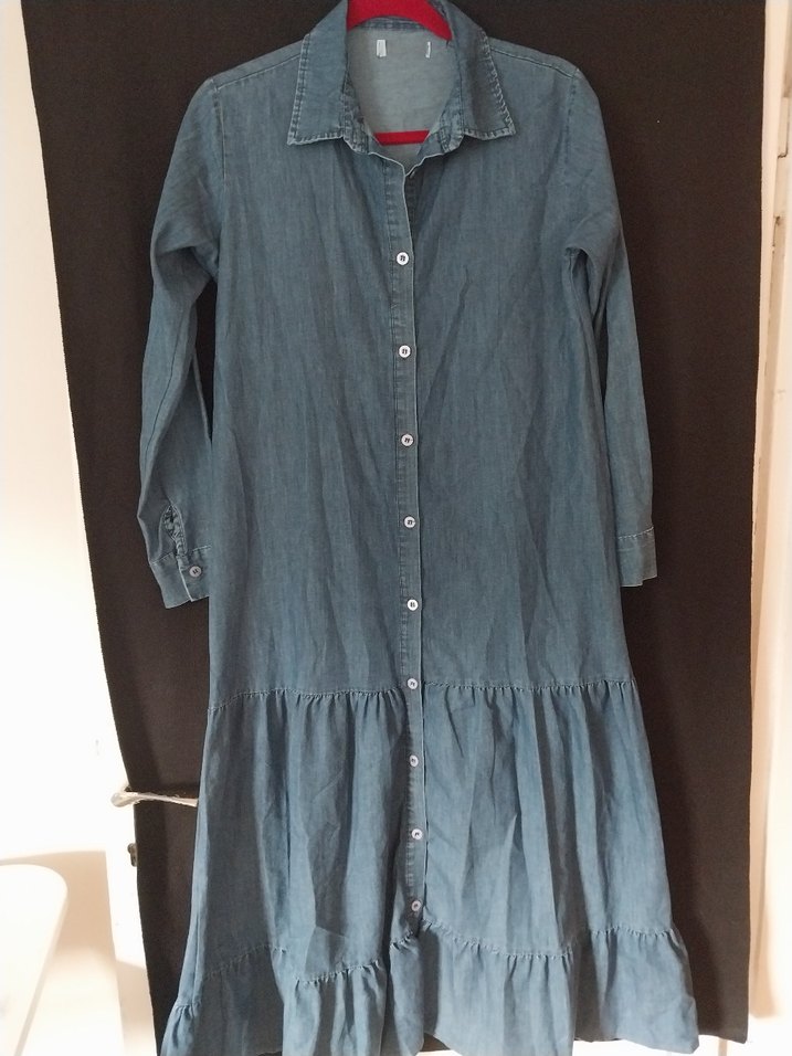 Mavi kot kumaştan yapılmış, düğmeli, uzun kollu ve yakalı hamile elbisesi. Salaş kesimi ve uzun boyuyla günlük kullanıma uygundur.