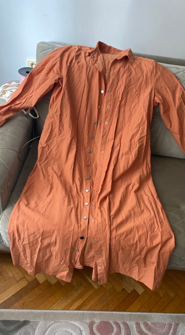 Düğmeli, yakalı ve uzun kollu, bol kesim bej hamile tunik, yumuşak keten kumaştan yapılmıştır.