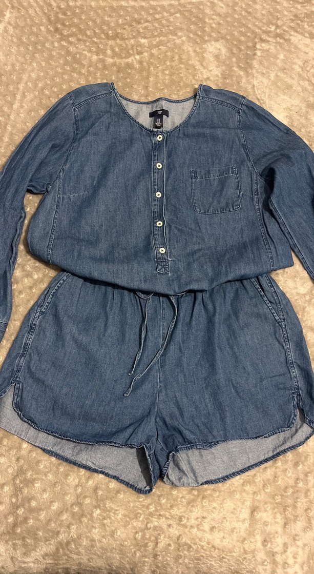 Düğmeli önü, uzun kollu ve yuvarlak yakalı kadın tulumu. Yumuşak denim kumaştan, bol kesim, bağcıklı bel ve kısa paçalıdır. Rahat ve günlük kullanım için uygundur.
