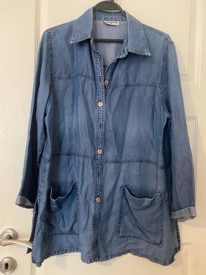 Düğmeli ön, uzun kollu ve yakası kesik detaylı kadın denim gömlek. Rahat kesim, midi boy ve iki ön cepli. Günlük sokak tarzına uygun mavi tonlarında sade gömlek.
