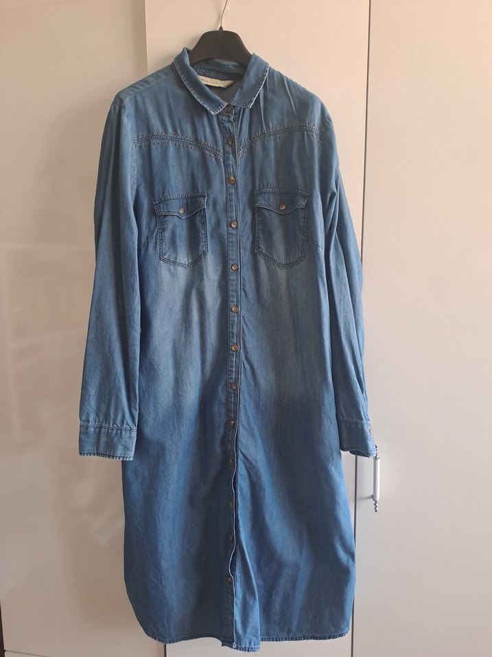 Mavi denim midi ceket, düğmeli, uzun kollu ve notlu yaka detaylıdır. Salaş kesimi ve iki göğüs cebi vardır, günlük kullanıma uygundur.