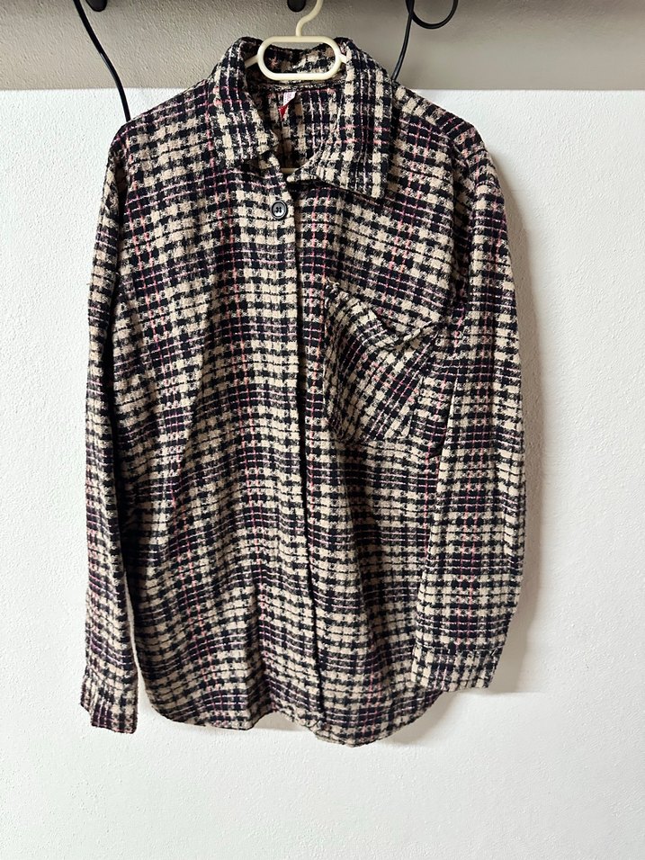 Düğmeli, uzun kollu, yün kumaştan rahat kesim kadın gömleği. Koyu kahverengi ve ekose desenli, günlük sokak stili için uygun. Defosu yok marka temsili