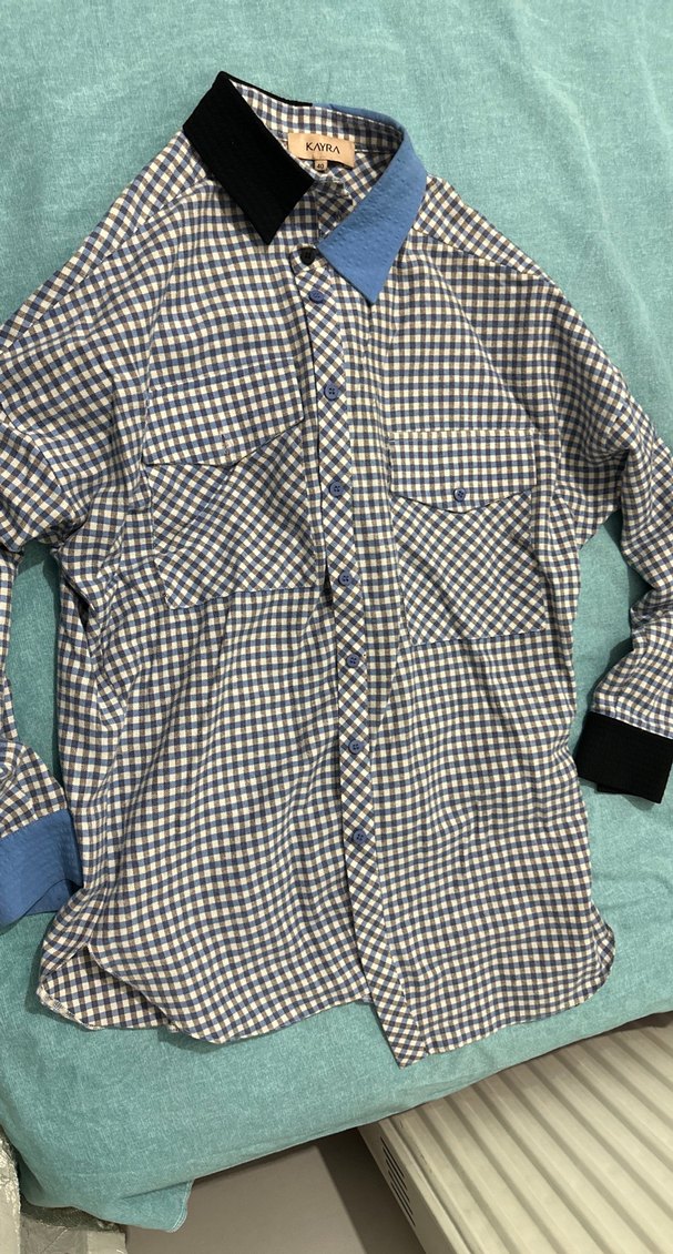Düğmeli önü, uzun kollu ve yakası kesimli, mavi-gri kareli dokuma kumaştan yapılmış, günlük sokak tarzına uygun kadın gömlek.