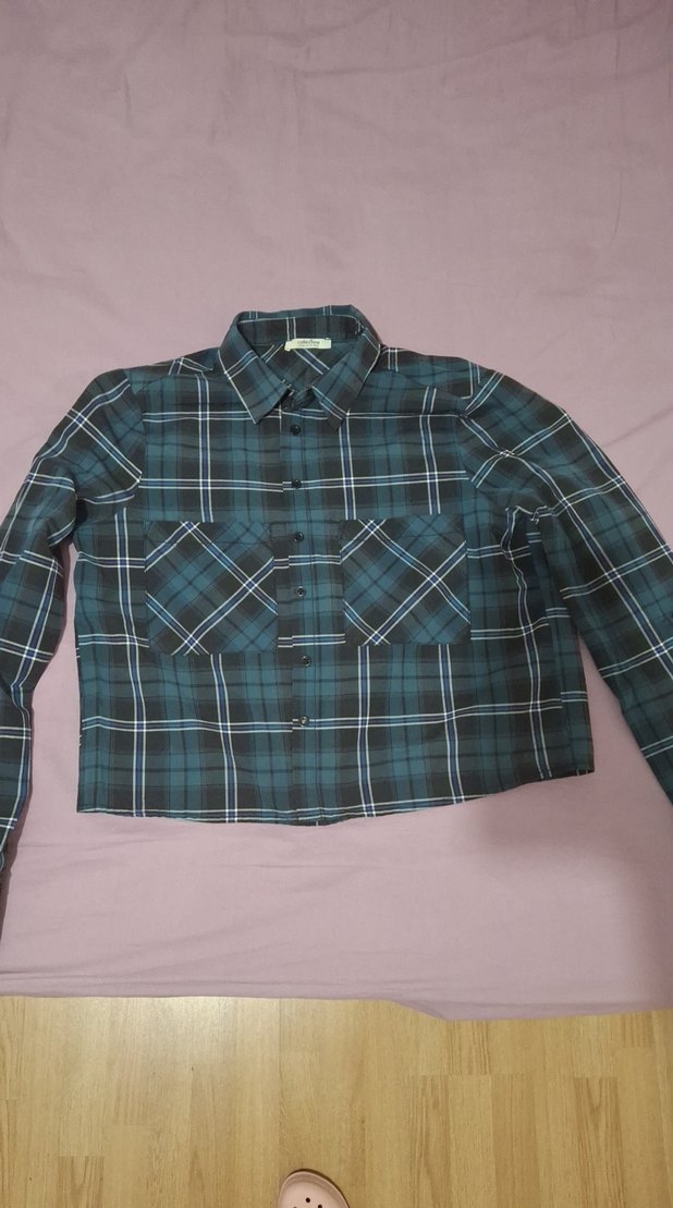Düğmeli ön kısmı, yakalı ve uzun kollu kadın gömleği. Sentetik kumaştan, koyu kahverengi ve ekose desenli, rahat kesim ve günlük sokak stili için uygun.