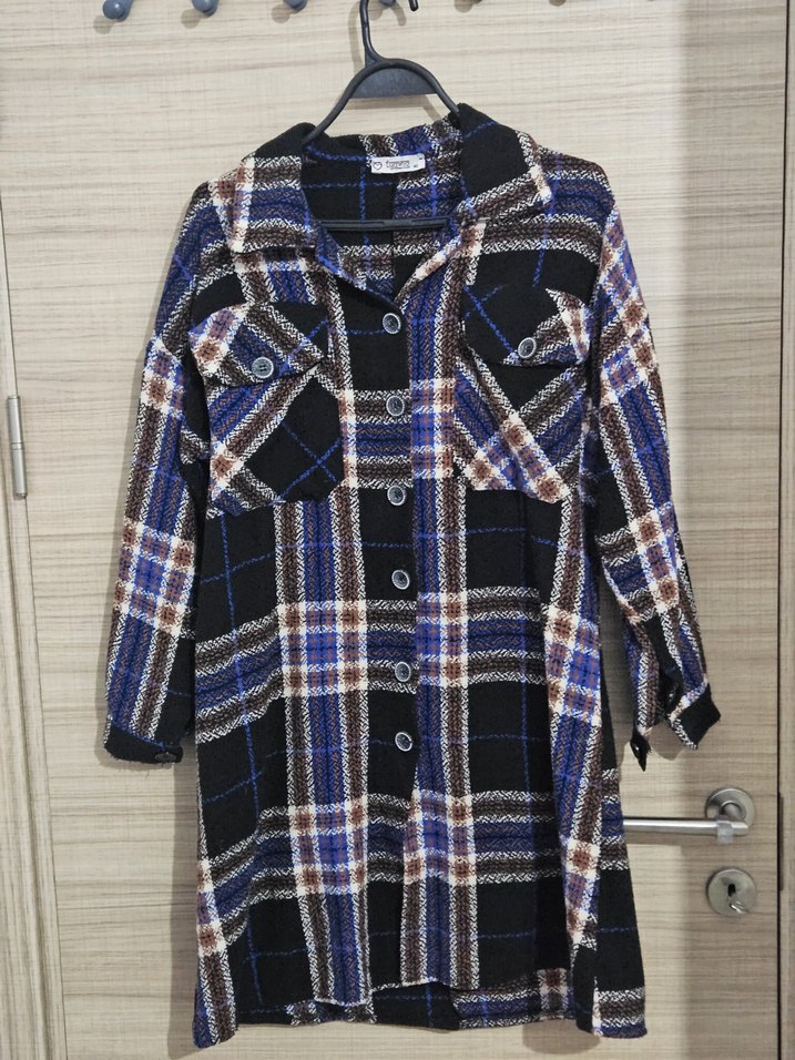Düğmeli, uzun kollu, bol kesim kadın uzun gömlek . Koyu mavi ekose desenli, rahat ve günlük sokak stili için uygundur.