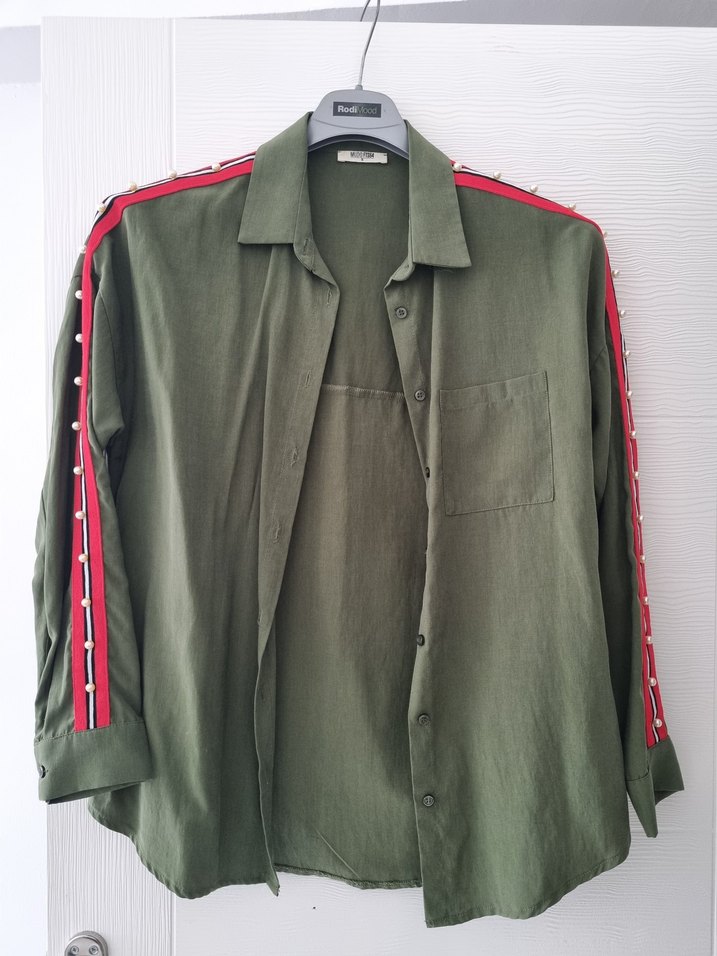 Düğmeli, uzun kollu ve bol kesim kadın gömleği. Sentetik kumaştan üretilmiş, işlemeli ve kollarında kırmızı şeritlerle süslenmiş. Günlük kullanım için uygun, defosu yok