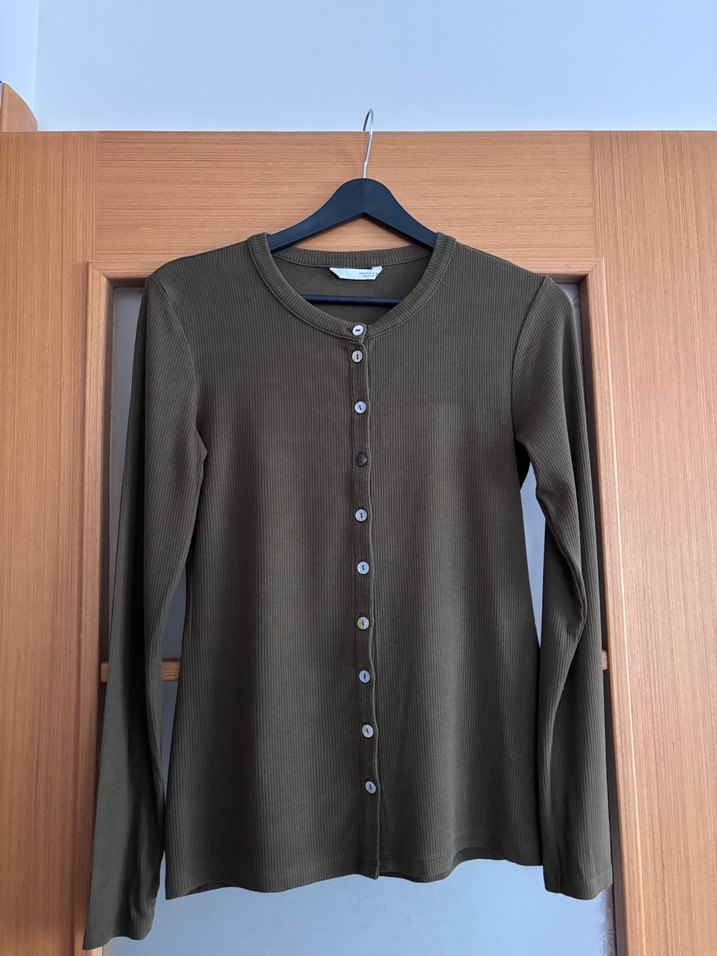 Düğmeli, yuvarlak yaka ve uzun kollu kadın hırka. Pamuklu yumuşak kumaştan, bol kesim ve normal boyda. Günlük kullanıma uygun haki renk, minimal tasarım.