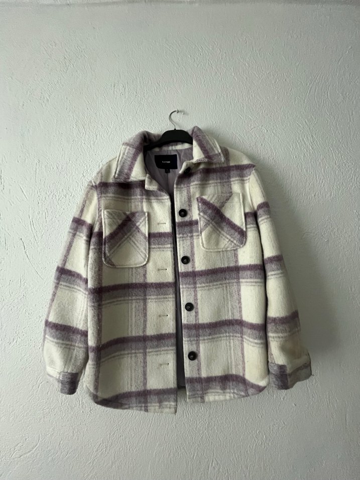 Düğmeli, yaka detaylı, uzun kollu kadın içi astarlı kaban Mor ve gri tonlarında yumuşak yün kumaştan, rahat kesim ve günlük kullanım için uygun.Hiç kullanılmamış
