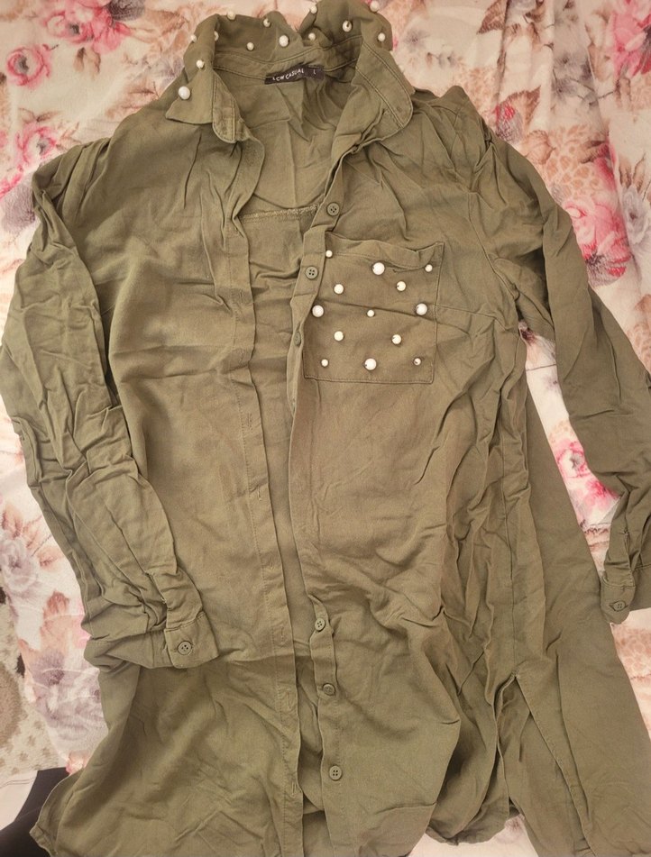 Khaki renkli, uzun kesim ve düğmeli keten gömlek. Notlu yaka ve cepte inci detaylarıyla rahat ve şık, günlük sokak stiline uygun.