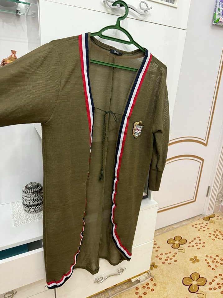 Khaki renkli, düğmeli ve uzun kollu kadın kimono. Notlu yaka ve nakış detaylarıyla, bol kesim ve parlak dokuda, günlük kullanıma uygun.