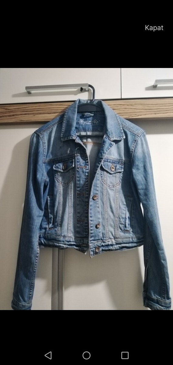 Fitted kesim, uzun kollu, düğmeli cepleri ve notched yakası olan mavi kot ceket, günlük sokak stiline uygundur.