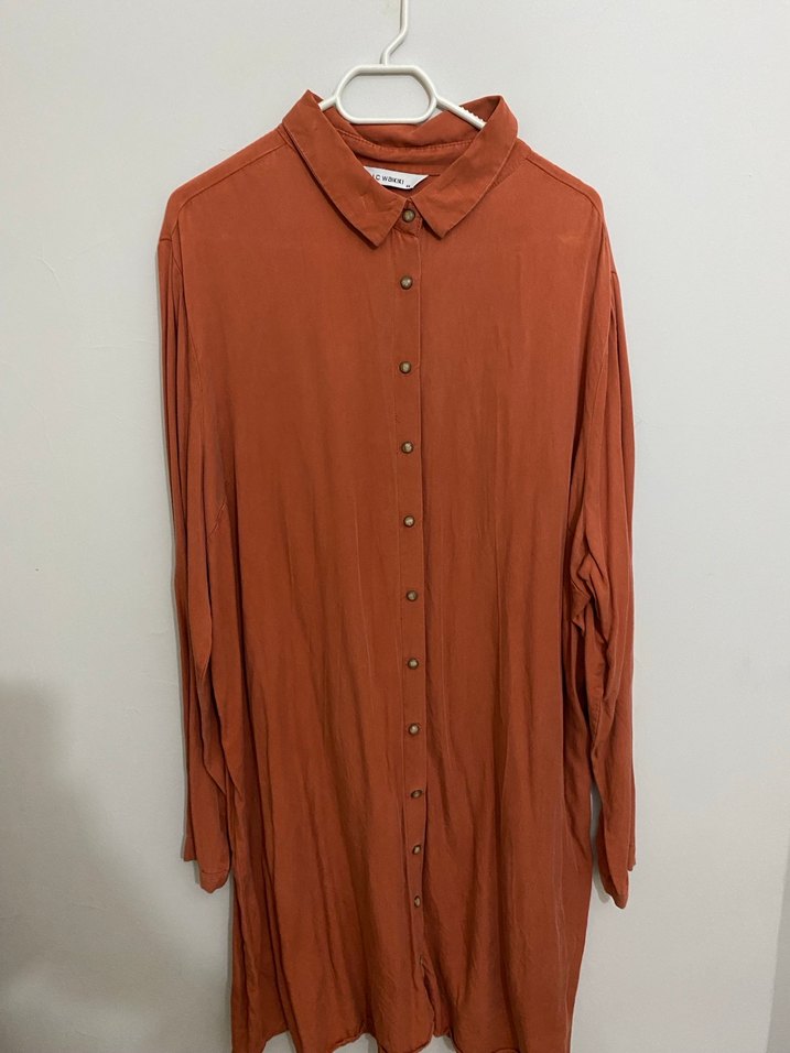 Kiremit keten kumaştan, düğmeli ön ve yakalı, uzun kollu, bol kesim midi gömlek. Minimalist tarzda, günlük kullanıma uygun.