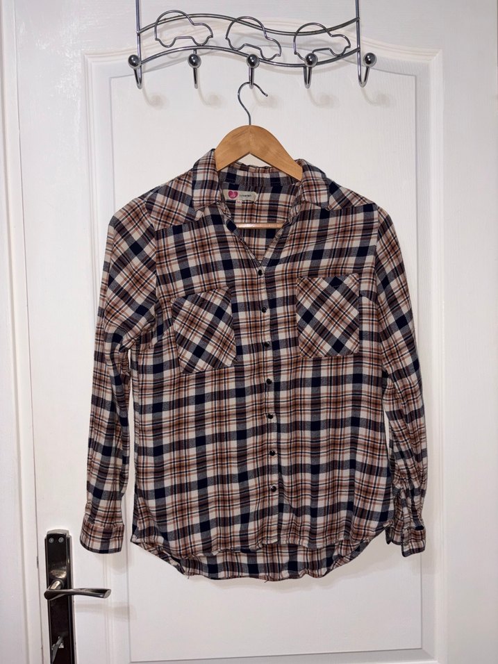 Düğmeli ve uzun kollu, pamuklu kumaştan yapılmış kadın gömleği. Kahverengi tonlarında kareli desenli, rahat kesim ve normal boyda, günlük ve sokak stiline uygun. Koton markasına aittir ve 36 bedendir.