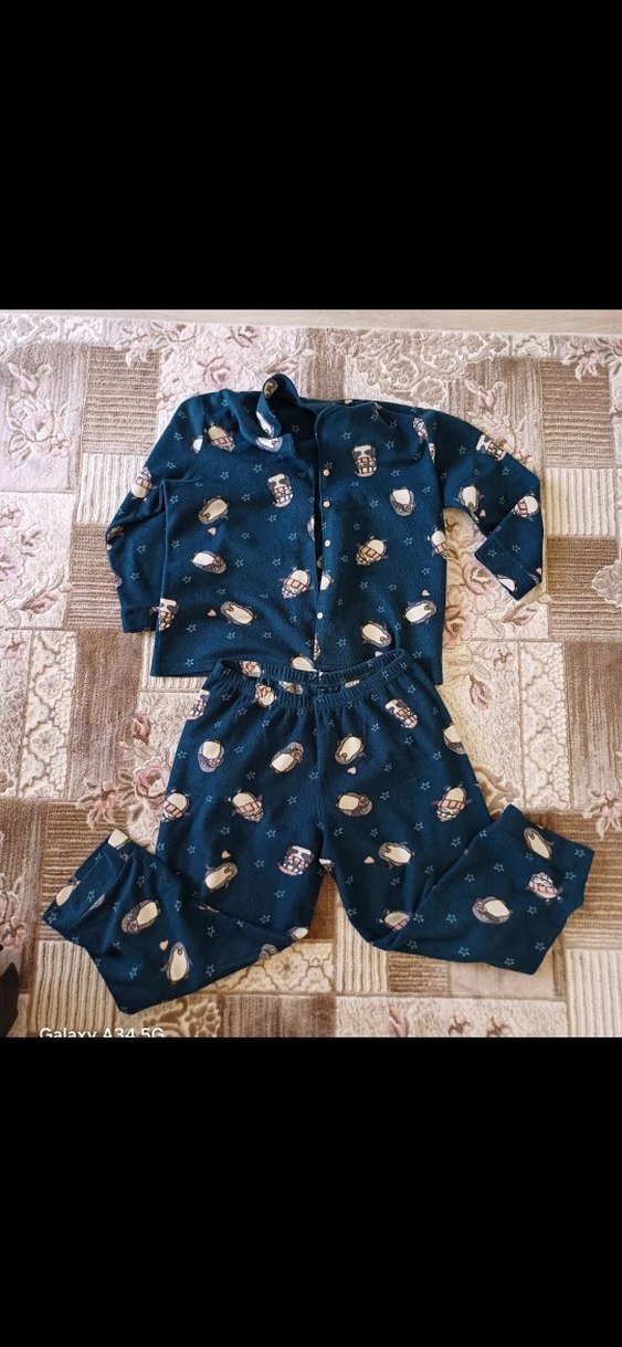 Koyu mavi renkli, desenli, düğmeli ve yakalı uzun kollu bol kesim kadın pijama takımı. Rahat ve konforlu kullanım için uygundur. 3XL iç kısımlarda hafif topaklanma mevcut ama rahatsız etmiyor