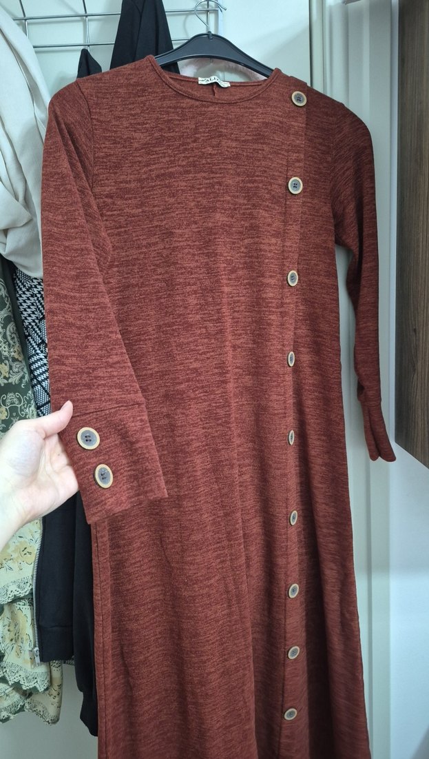 Kahverengi uzun kollu triko elbise, yuvarlak yaka ve ön ile kol düğme detaylarına sahiptir. Yumuşak yün kumaştan yapılmış, rahat kesimli ve bohem tarzda günlük kullanım için uygundur.