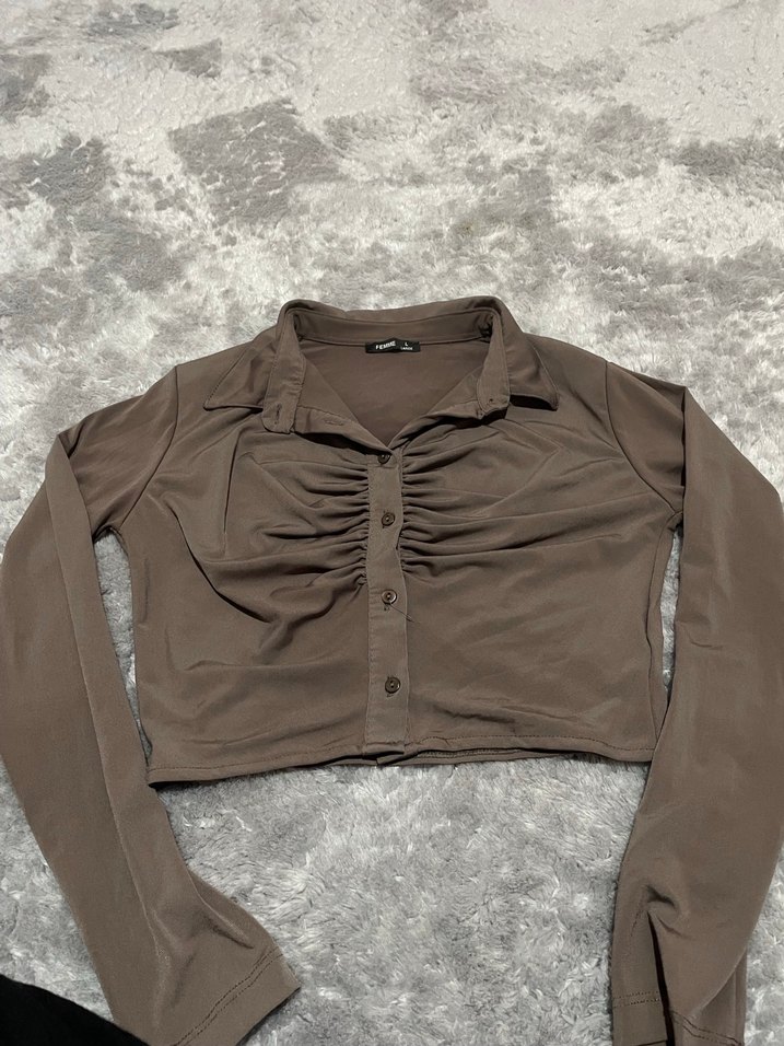 Uzun kollu, yakalı ve düğmeli kahverengi bluz. Göğüs kısmında büzgülü detayları olan, yumuşak keten kumaştan, günlük rahat kullanıma uygun.